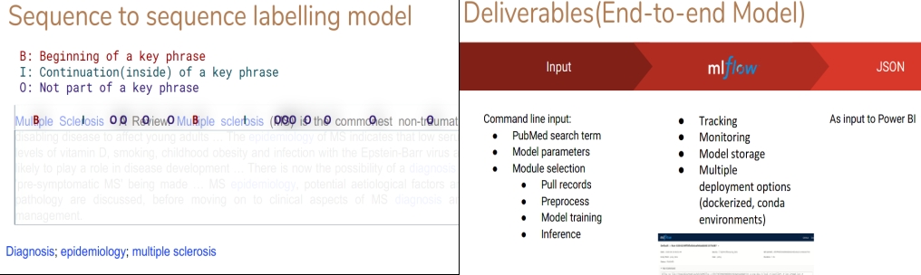 I first started with traditional unsupervised keyphrase extraction models like TF-IDF and TextRank, however, their performances are not good enough for the company. I then built the keyphrase extraction model as a sequence tagging model and used Bi-LSTM neural net architecture, which achieved much better performance. By adding a Conditional Random Field model that takes the LSTM output to calculate its emission score and builds relationship among adjacent predicted labels, the model performance was further improved. Noticing that the many out of vocabulary keyphrases not tagged by the model, I switched to use BioWordVec which includes sub-word embeddings and was trained on the PubMed database to further improve model performance.